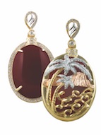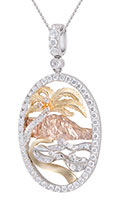 Diamond Head and a landscape of coconut trees and ocean waves are rendered in 14-karat tri-color gold accented with diamonds.
