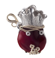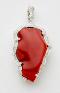 “Bai Bao Dai” meaning Fortune Bag in Chinese is important in the Chinese culture. These fortune bags represent luck, good fortune, and prosperity. This design, named after the popular Chinese tradition, was created by first selecting a naturally shaped red coral piece and decorated using 14 karat white and yellow gold and diamonds.