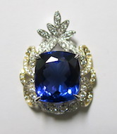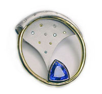 “The tanzanite is bezel-set in the inner edge of this circular pendant. A row of diamonds are pave-set on the raised barrel tube, which partially covers the top of the pendant. Assorted color diamonds are flash-set in the inner plate. This 18-karat piece can also be worn as a brooch.”