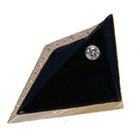 “Arouses the mystic of a bottomless gulf with bezel-set diamonds embedded in a unique quadrilateral black onyx, shadowing an array of pave-set diamonds. To be worn as a brooch or pendant.”