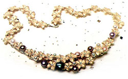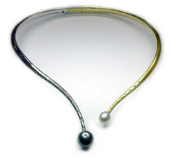“18-karat neckpiece with silverfish and black Tahitian pearls set on opposite ends, followed by a string of diamonds.”