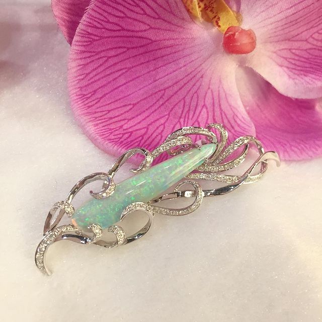 At the heart of this elegant brooch is a lustrous opal. Cascading ribbons of 14 karat white gold and brilliant diamonds capture the opal’s iridescent beauty.