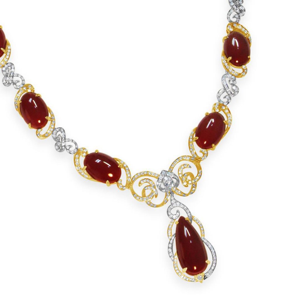 This necklace is highlighted by seven red Pacific coral gems in hinged pieces of diamond ribbons in 18-karat white and yellow gold.