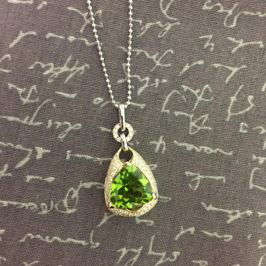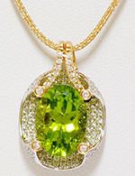 Shimmering like the morning’s dew on a lotus flower, micro pave diamonds around and behind highlight an exquisite peridot gem. All masterfully crafted in 14 karat white and yellow gold.