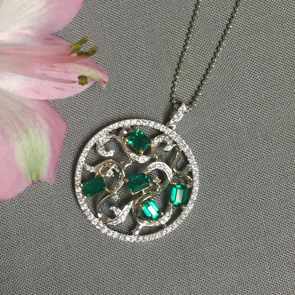 This beautiful emerald and diamond pendant evokes nature with its floral flourishes. The five emeralds, 1.62 carat total weight, are delicately arranged like flowers attached to swirling stems and leaves of 14 karat white gold, set with diamonds, 0.77 carat total weight.