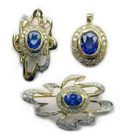 April 1994 Hawaii Jewelers Association Competition Nebula COLOR GEM CATEGORY Second Place "Interchangeable ring-pendant-brooch combination, crafted in 14-karat gold and enhanced by a 2.26-carat sapphire and pave-set diamonds." |