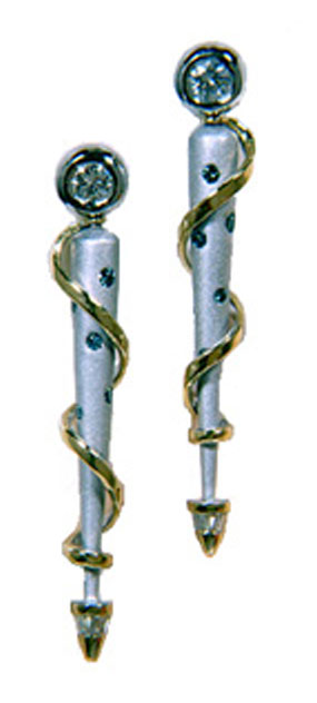 October 1996 Hawaii Jewelers Association Competition Needles of Naiads DIAMOND CATEGORY Second Place Popular Award "18-karat gold earrings accented with a pair of bezel-set diamonds with a thread of yellow gold spiraling around the white gold needles, set with blue diamonds." |